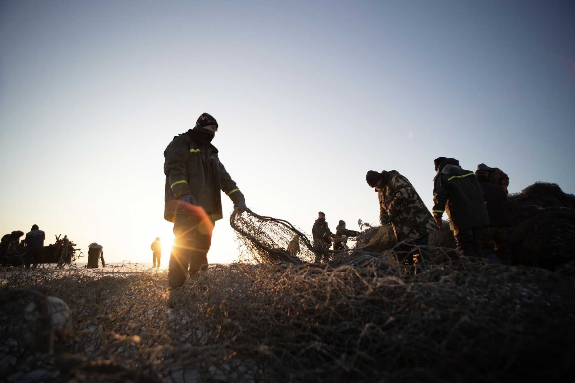 Buổi sáng, đoàn chụp ảnh nghi lễ đầu tiên trong lễ hội đánh cá truyền thống: đục lỗ trên mặt băng và thả lưới dưới lớp băng hồ.